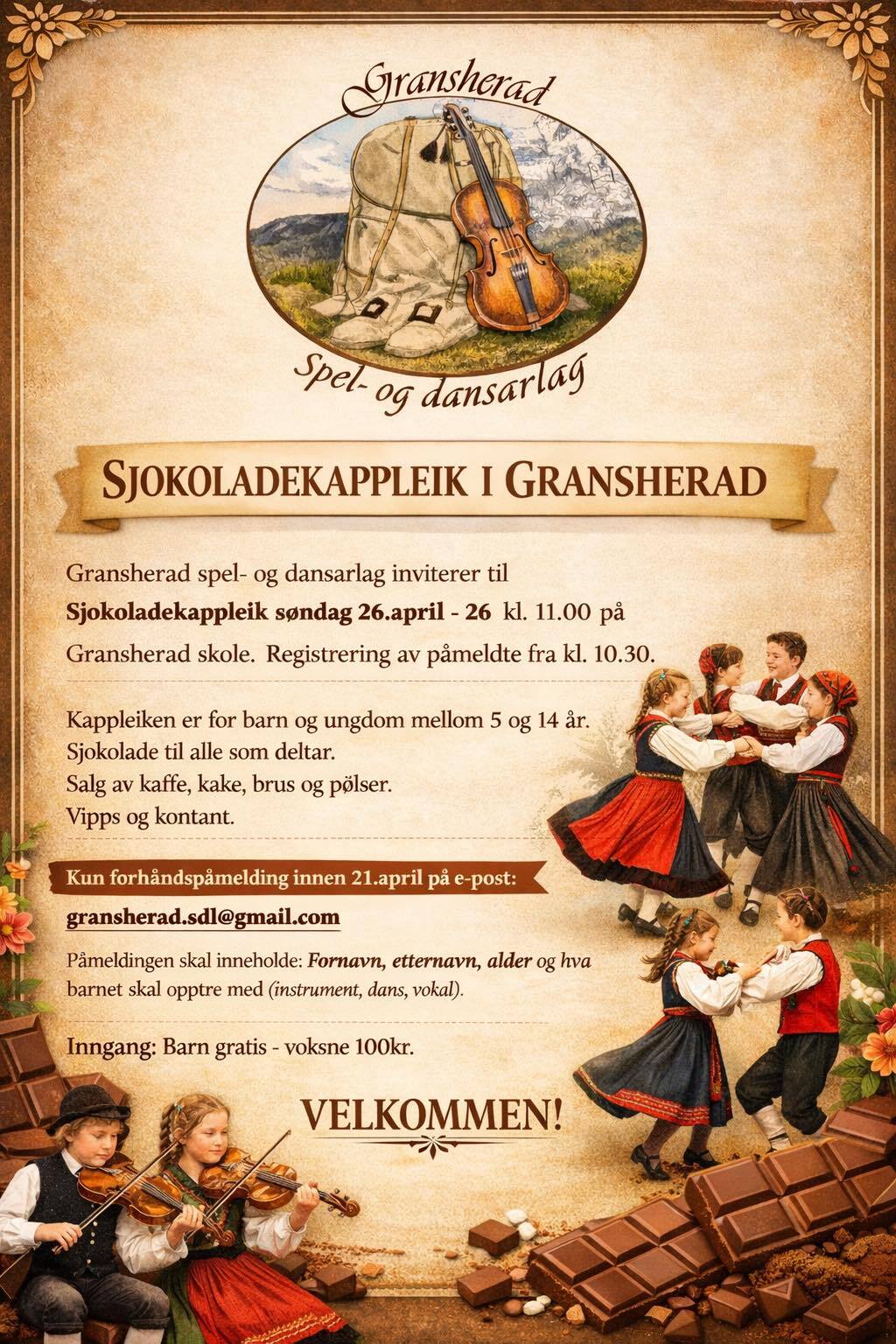 Gransherad spel- og dansarlag inviterer til sjokoladekappleik søndag 26. April 2026 kl. 11:00